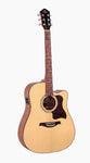 The GILMAN 50 Series Acoustic Electric Guitar features a dreadnought design with a Venetian cutaway. Its spruce top is complemented by walnut back and sides, with tortoiseshell 4 ply ivory/black top binding and tortoiseshell 3 ply ivory/black side and back binding. The bound nato neck features a black walnut fingerboard with 4mm pearl dot inlays and a dovetail joint. A double ring rosette and centre back strip add to the guitar's elegant design. The guitar also includes a tortoiseshell scratch-plate and a black walnut bridge. The Graph Tech Canada NuBone XB nut and compensated saddle, along with Grover style chrome diecast machine heads and D'Addario USA strings, ensure quality sound and playability. The Fishman pickup and Presys II 2 band EQ preamp, complete with LCD tuner and volume, bass, and treble controls, make this guitar perfect for stage performances.