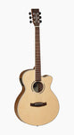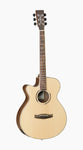 The range comes in dreadnought, folk, super folk and left hand models so you are sure to find the one to meet your needs! Our deluxe model features all ebony wood, super folk cutaway / electric, maple binding and a natural gloss finish.