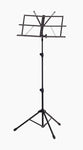 Black plated music stand. heavy duty strong tubular frame with ABS housing. 3 sections. Page stays. Tripod base. Fold-up music desk with adjustable desk angle. Carry bag included.