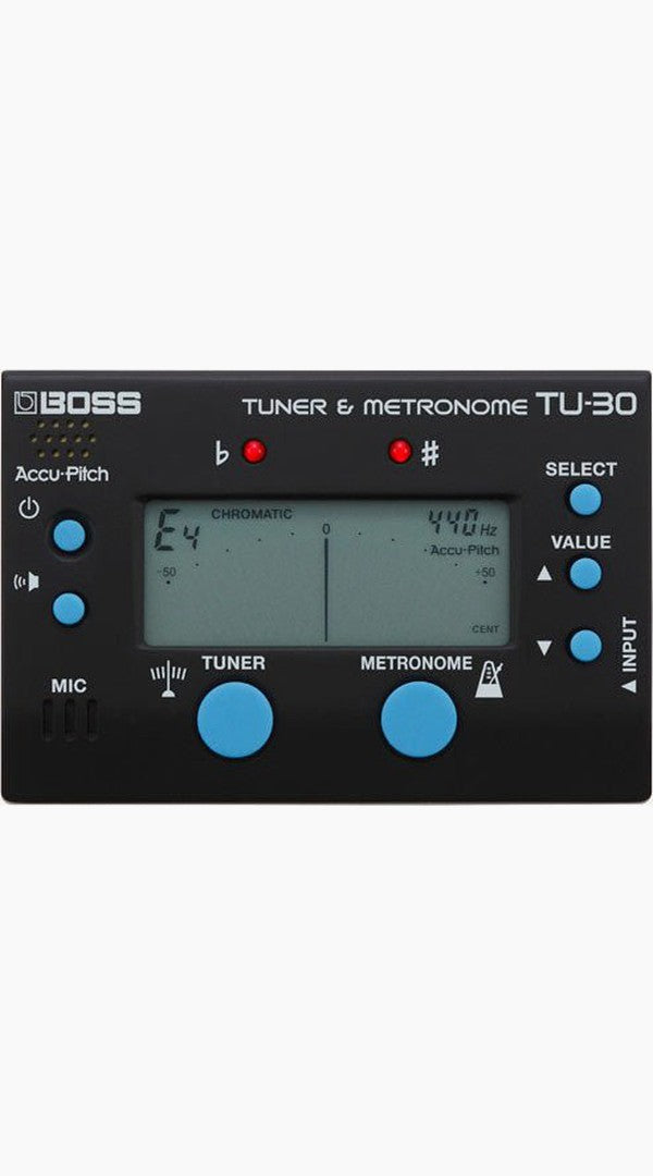 For years, the TU-80 Tuner & Metronome has been an essential tool for musicians and music educators everywhere. With the TU-30, BOSS delivers the TU-80’s main features in an even more compact size. All the basics are carried over, including Accu-Pitch, multiple tuning modes and rhythm patterns, the ability to sound reference pitches, and more. Combining trusted BOSS tuning with a versatile metronome, the TU-30 is a must-have companion for learning, practice, and performing.